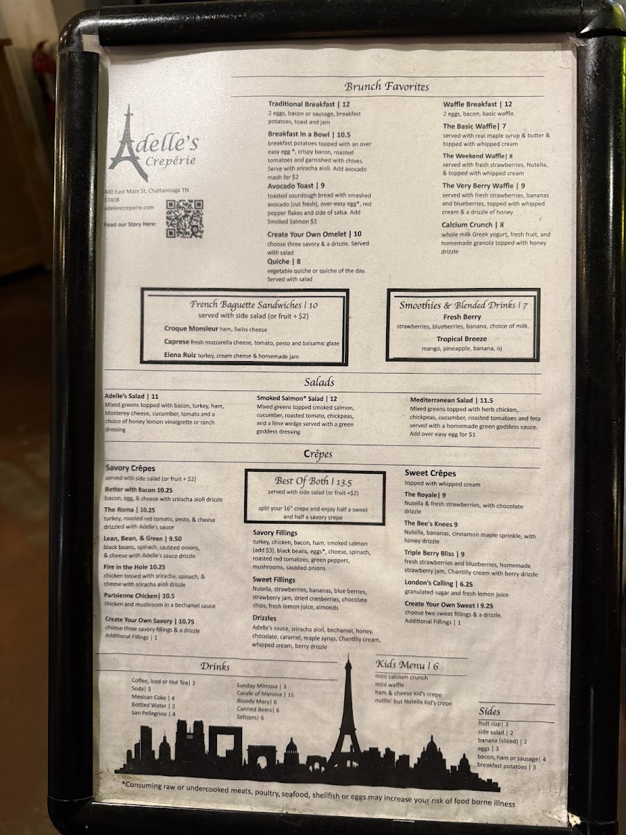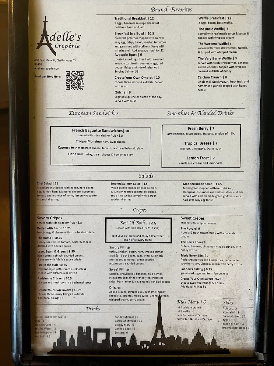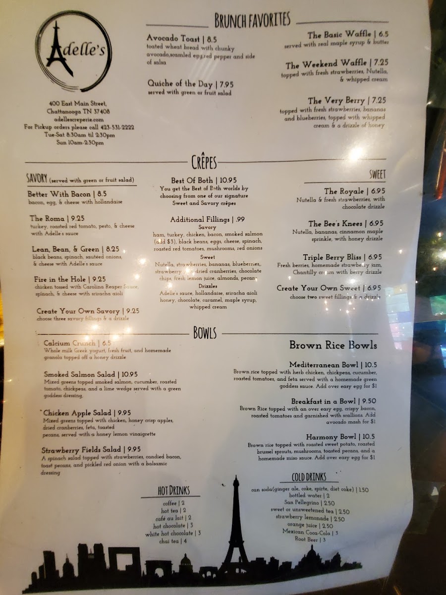 Located in the heart of Chattanooga, Adelle's Crêperie offers a delightful blend of sweet and savory crêpes, perfect for any palate. Their brunch favorites shine, with highlights like Avocado Toast and the delightful Quiche of the Day, each crafted with fresh, quality ingredients. The sweet crêpes are a must-try, featuring classics such as Nuttin' But Nutella and Miss American Pie, providing a whimsical touch to your dining experience.