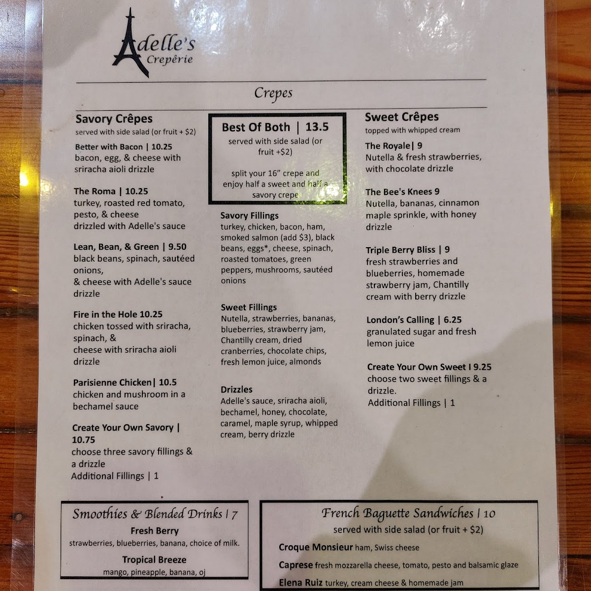 Customer reviews rave about the cozy atmosphere, enhanced by live music, and the top-notch service that makes every visit memorable. Whether you're indulging in a Smoked Salmon Salad or savoring the candied flavors of The Bee’s Knees crêpe, every bite bursts with flavor. Adelle's is not just a meal; it’s an experience worth returning to!